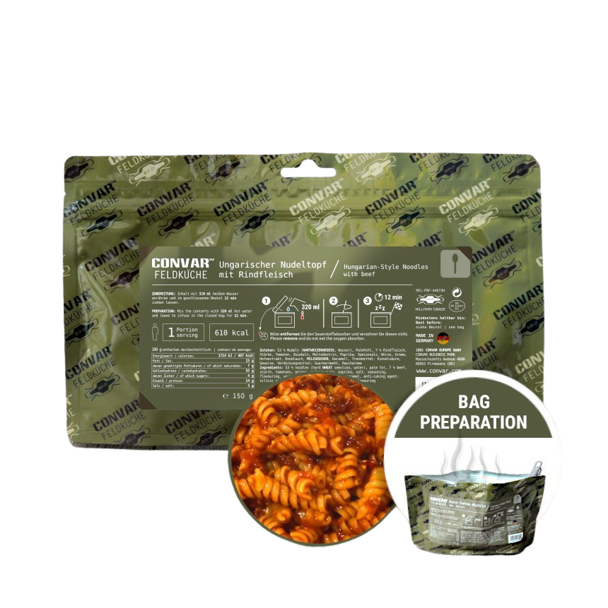 CONVAR™ Hongaarse Rundvleesnoedelstoofpot is een energieke combinatie van noedels, rundvlees en een licht pittige paprikasaus. Ideaal voor veldrantsoenen, noodvoorraden of lange wandelingen, deze maaltijd garandeert een betrouwbare calorieboost zonder in te leveren op smaak.