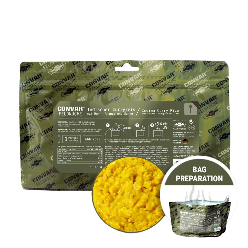 Inspiré des saveurs exotiques du sous-continent indien, ce repas lyophilisé longue conservation (10 ans) signé CONVAR™ marie la douceur de l’ananas à la chaleur du curry et à la richesse d’un riz crémeux au poulet. Idéal pour reconstituer ses forces après une mission, une randonnée ou en situation de crise, ce repas combine apports caloriques élevés, digestibilité et praticité de stockage.