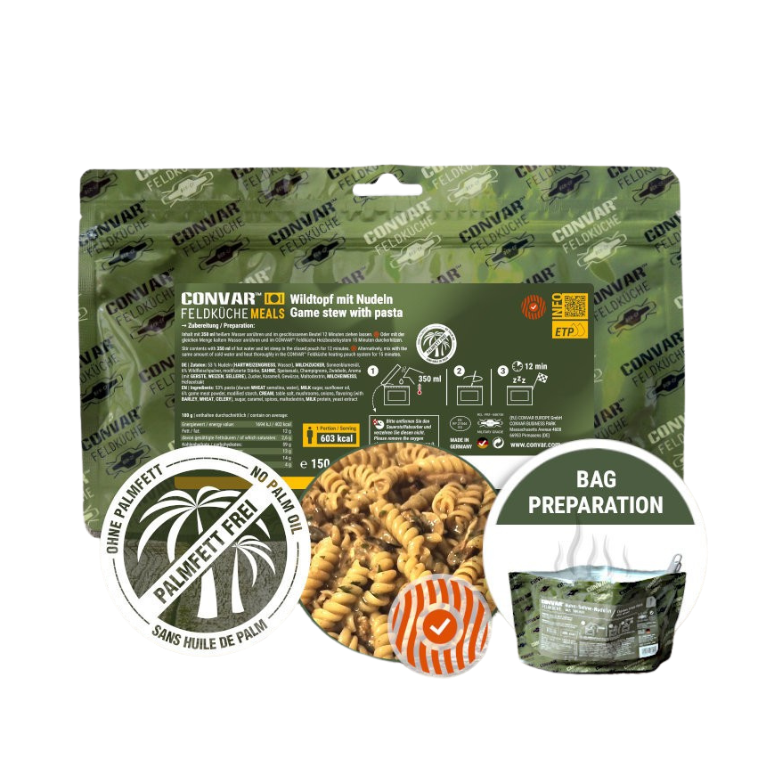 Stockage d’urgence, campements, missions longues : la potée de gibier CONVAR™ est un allié fiable pour tenir sur la durée, en autonomie complète.