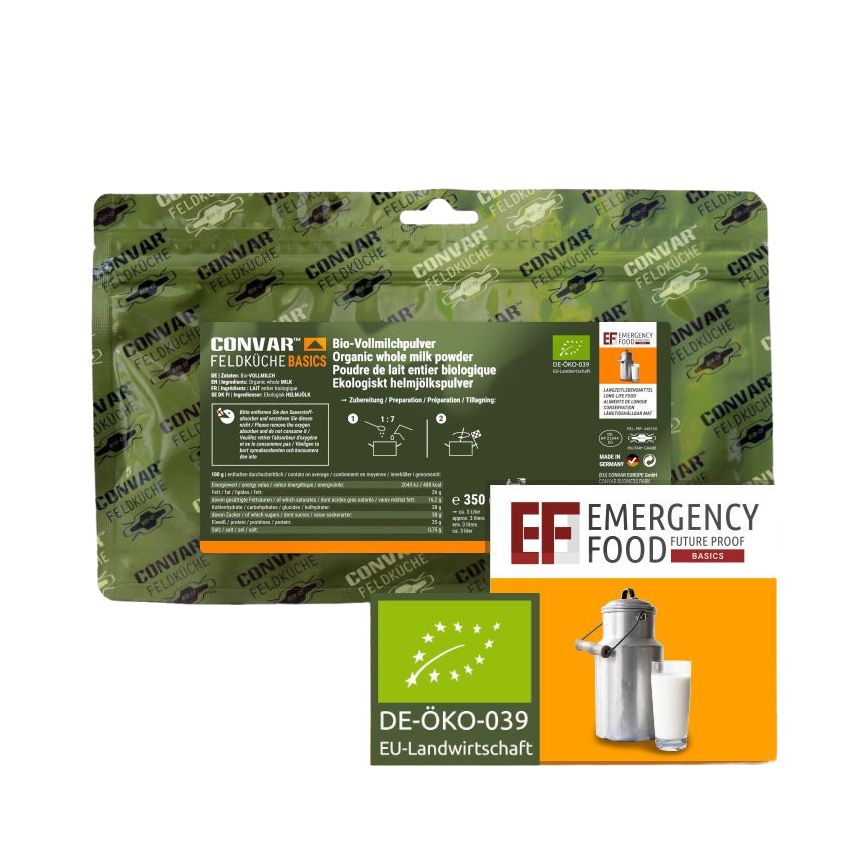 La poudre de lait entier bio de CONVAR™ BASICS est un ingrédient essentiel pour toute alimentation de secours, survivaliste ou d'expédition. Elle se délaye facilement dans l'eau froide et permet de reconstituer environ 3 litres de lait à partir du sachet. Polyvalente, elle est idéale pour la boisson, les préparations culinaires ou encore la pâtisserie.