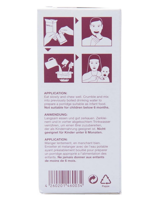 - Utilisation instantanée : Prête à consommer, sans cuisson ni préparation nécessaire. Peut être consommée telle quelle, émiettée dans de l’eau ou transformée en bouillie nutritive.