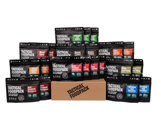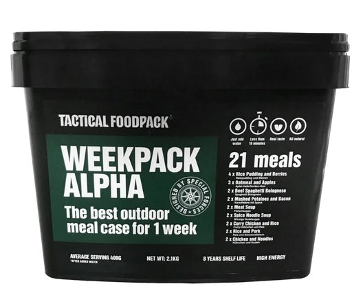 Le Tactical Foodpack Week Pack Alpha représente la solution complète d'autonomie alimentaire pour une semaine en situation tactique ou d'urgence. Ce pack rassemble une sélection rigoureusement calibrée de 21 repas lyophilisés haute performance, fournissant l'équivalent de 7 jours complets de nutrition (petit-déjeuner, déjeuner et dîner) pour une personne, ou 3-4 jours pour deux personnes.